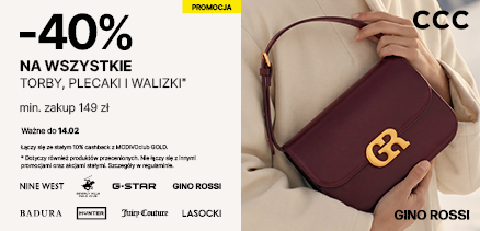 Nowa torebka? Plecak? Walizka? A może kosmetyczka, która zmieści wszystko to, co niezbędne? Teraz w CCC modele znanych marek kupisz 40% taniej! Zrób zakupy za minimum 149 zł i zyskaj rabat na wymarzone torebki, plecaki, walizki lub kosmetyczki! Superceny czekają w CCC!