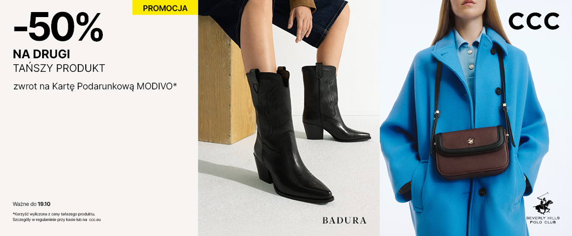 Czas na zakupy tańsze nawet o 50%? Da się zrobić! Wybierz dwa produkty, a 50% wartości tańszego z nich wróci na Twoją Kartę Podarunkową MODIVO! Skorzystaj z okazji i wybierz ulubione marki, wygodne obuwie lub stylowe torebki oraz akcesoria! Szczegóły oferty w regulaminie.