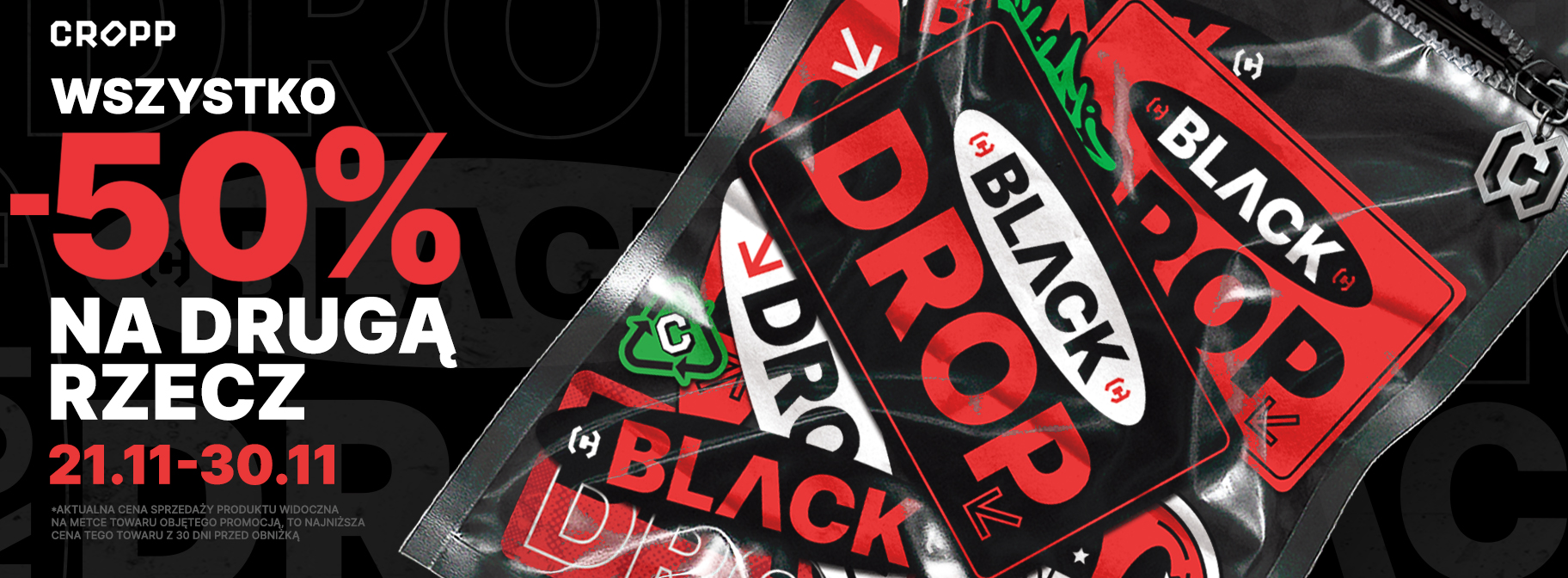 W dniach 21.11-30.11 we wszystkich sklepach Cropp startuje BLACK DROP. Wpadaj do sklepu i skorzystaj z promocji -50% na drugi produkt, na cały asortyment.
