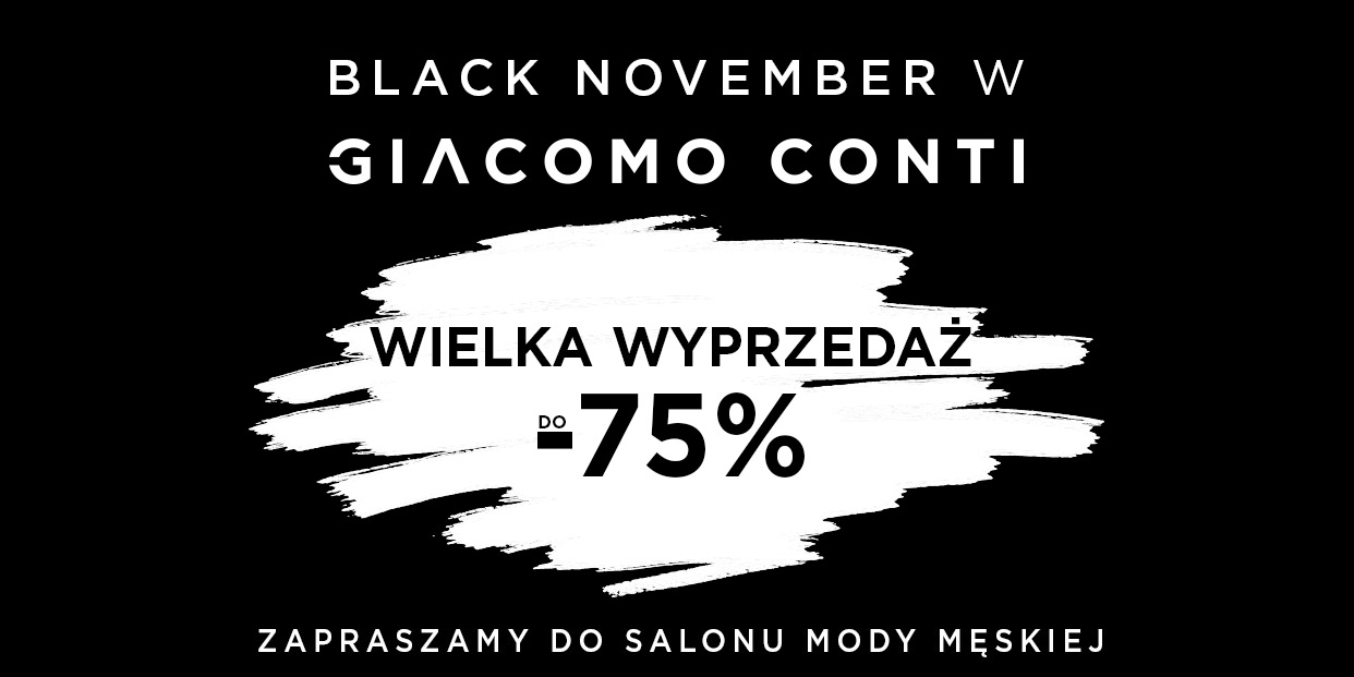 Świętuj z nami BLACK NOVEMBER! Już teraz w salonie mody męskiej Giacomo Conti WIELKIE rabaty! Druga sztuka za pół ceny i wiele produktów do -75% taniej! Nie czekaj, takie promocje zdążają się raz