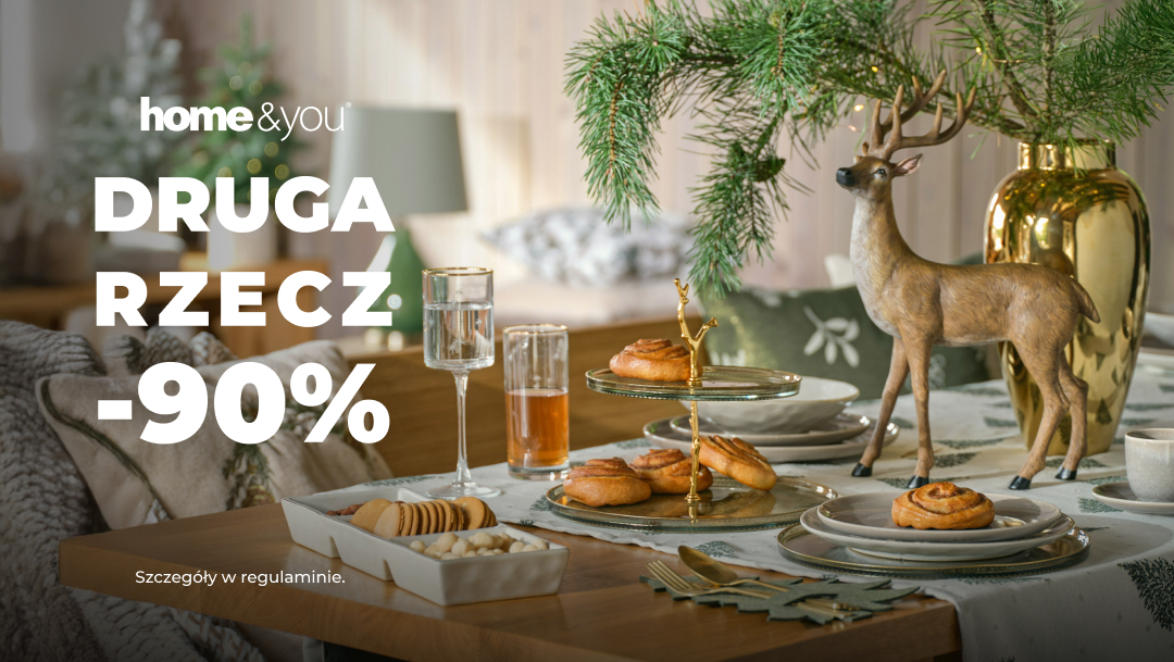 W salonach home&you trwa promocja DRUGA RZECZ -90%, a w niej m.in. pościele, zastawy, dekoracje świąteczne i wiele, wiele innych! A za każde wydane 100 zł zyskasz BON 150 zł na następne zakupy! Szczegóły w regulaminie i na home-you.com