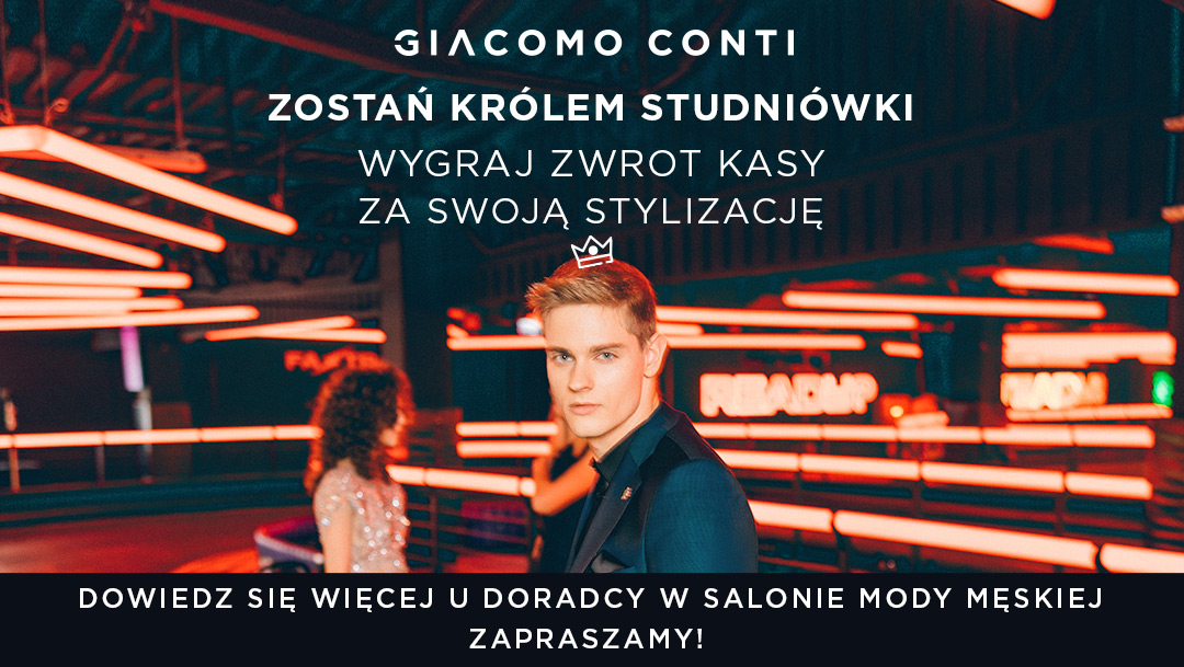 Chcesz wejść na salę jak prawdziwy król? Teraz masz szansę nie tylko wyglądać zjawiskowo, ale… wygrać zwrot kasy za swoją studniówkową stylizację! Zapraszamy do salonu mody męskiej Giacomo Conti i dowiedz się więcej!