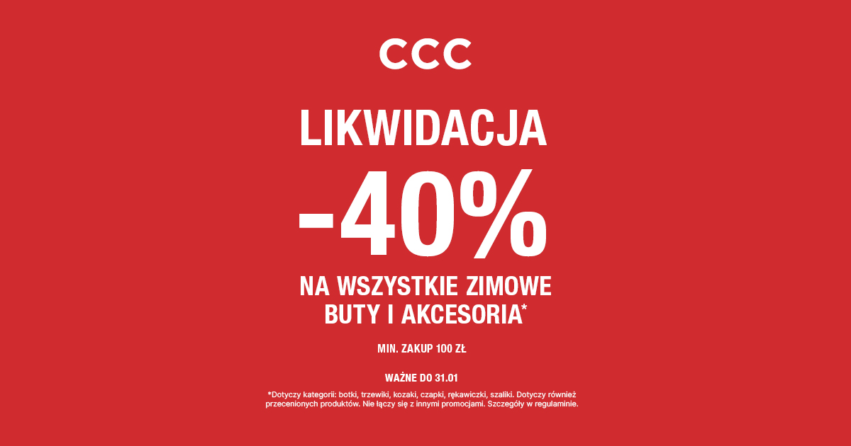 LIKWIDACJA w sklepie CCC! -40% na kolekcję zimową! Wszystkie botki, kozaki, trzewiki i akcesoria – nawet przecenione! Rabat aż 40% przy zakupach za min 100 zł tylko do 31 stycznia. Takiej promocji w CCC nie możesz przegapić! Szczegóły w regulaminie.