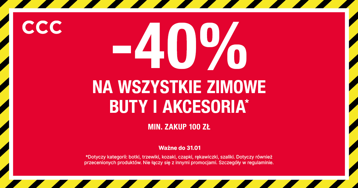 Mega okazja! W CCC aż -40% na całą kolekcję zimową! Botki, kozaki, trzewiki i akcesoria — nawet przecenione. Rabat aż 40% przy zakupach za min 100 zł. Tylko w salonach CCC. Szczegóły w regulaminie.