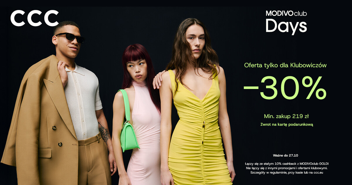 MODIVOclub DAYS w CCC! Zyskaj 30% w sklepach stacjonarnych. Zrób zakupy za min. 219 zł i odbierz 30% zwrotu na kartę podarunkową. Kupuj buty i dodatki znanych marek w CCC. Oferta dla Klubowiczów, ważna tylko do 27 października. Szczegóły w regulaminie.