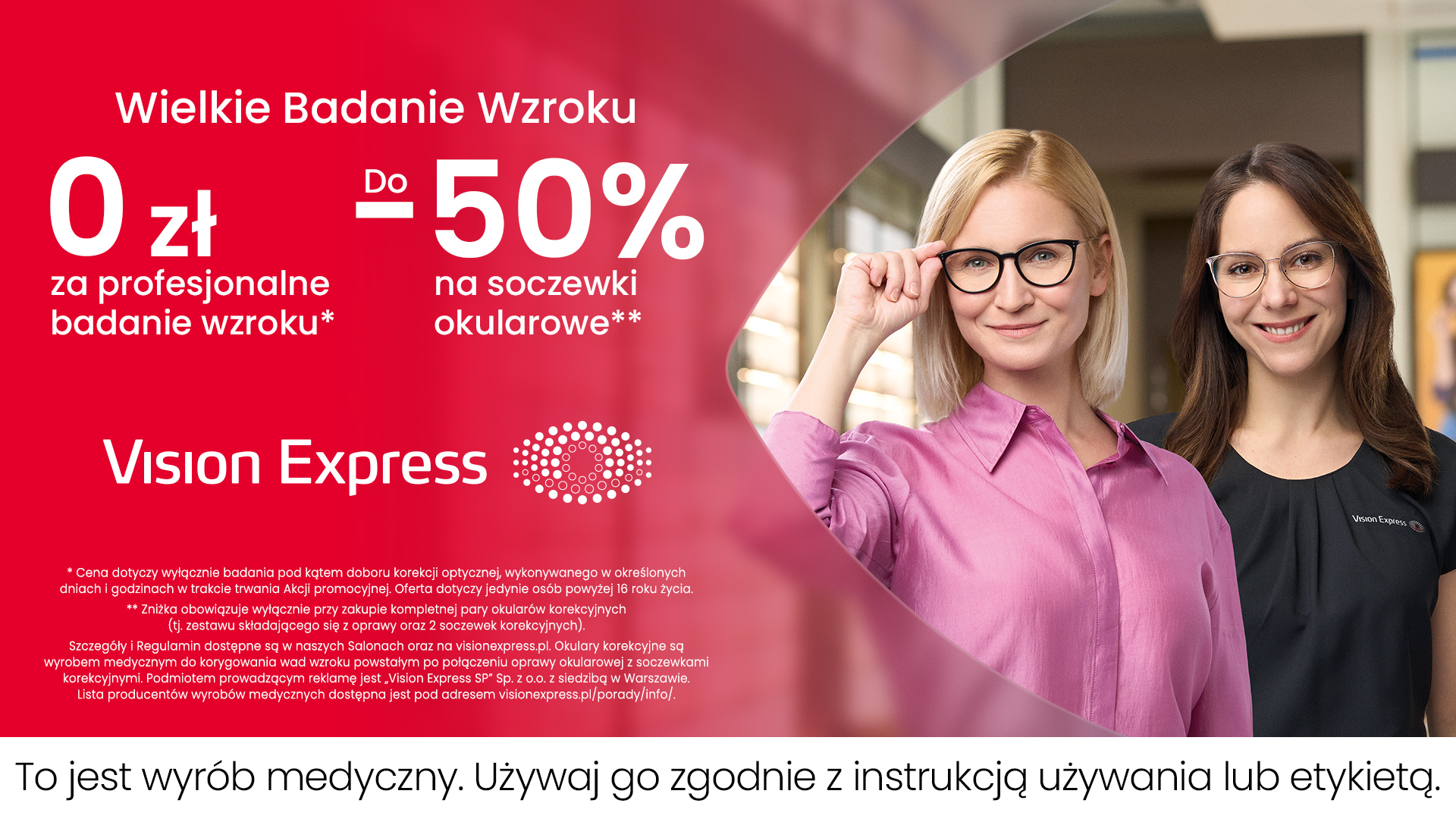 Okulary korekcyjne są wyrobem medycznym do korygowania wad wzroku powstałym po połączeniu oprawy okularowej z soczewkami korekcyjnymi. Podmiot prowadzący reklamę: „Vision Express SP” Sp. z o.o. z siedzibą w Warszawie. Lista producentów wyrobów medycznych dostępna pod adresem visionexpress.pl/porady/info/.