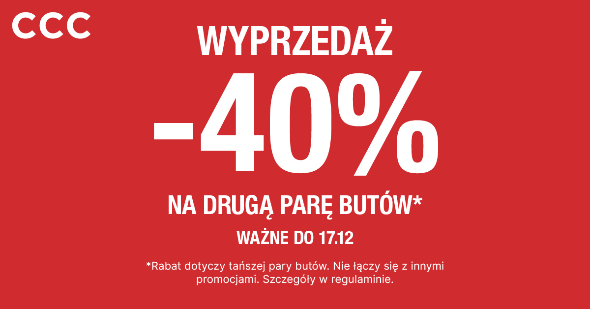 WYPRZEDAŻ W CCC RUSZYŁA!-40% na drugą tańszą parę butów! WSZYSTKIE modele obuwia od znanych marek teraz jeszcze taniej! Kup dwie pary i zyskaj rabat 40% na tańszą z nich!